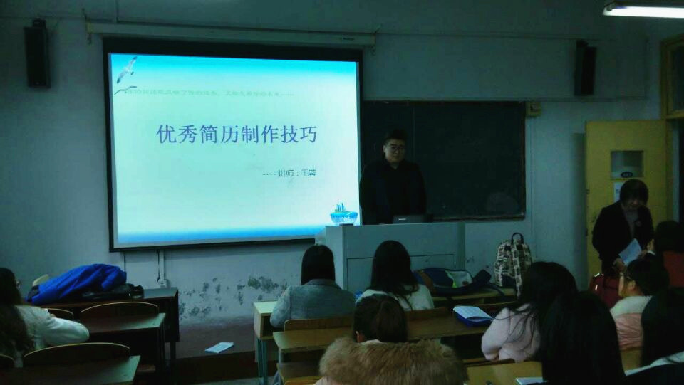 毛蓉老师详细认真的讲解风格、制作简历的优秀技巧都深深吸引着学生。在他讲解相关内容时,运用自身经历及实际范例使同学们加深对简历的认识,使同学们学习了简历制作的优秀技巧、以及各单位招聘人员对所投简历是如何筛选和选拔的方式方法,加大同学们应聘成功的机率。通过此次讲座同学们受益良多。