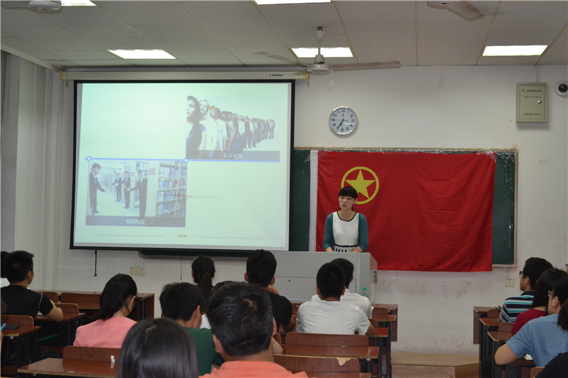 来自民航学院的大使团成员蒋增伊同学以通俗易懂,理论结合实例的方式给同学们详细介绍了在公共场合需要注意哪些行为,特别是做为一个大学生,当身处教室,图书馆,食堂等公共场合时,应该养成哪些良好的行为习惯。除此之外,还与同学们展开了互动,从同学们所展示出来的坐姿、站姿、走姿,进行一一纠正,并通过亲身展示来加强大家对三姿的理解,起到加深理解的作用。