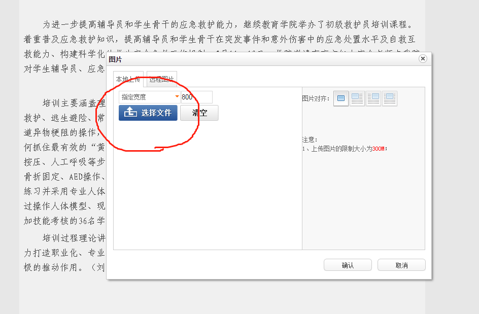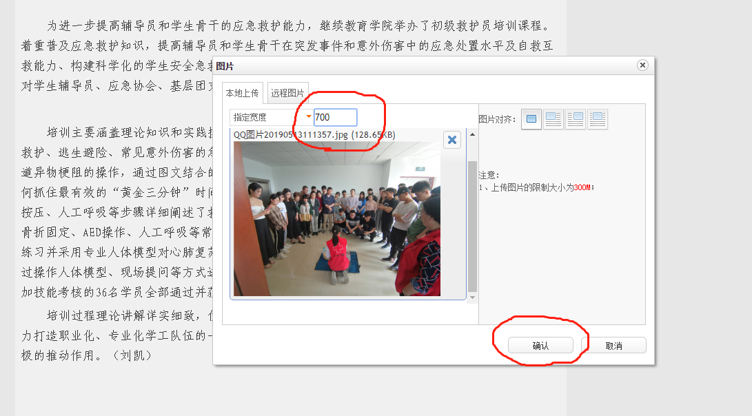 11.图片文件上传成功后,显示如下,将图片大小改成“700”,点击“确定”: