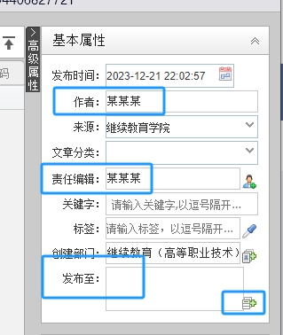 15.直到最终显示没有问题后,填写右边“基本属性”,需填写“作者”“来源”“责任编辑”“审核领导”和“发布至”(如果稿件只是在一个栏目里发布,则无需填写,如果在多栏目发布,则选择后面的加号增加栏目)(“作者”填实际稿件投稿人,“来源”填“yl8cc永利官网”,“责任编辑”填上传人姓名。)