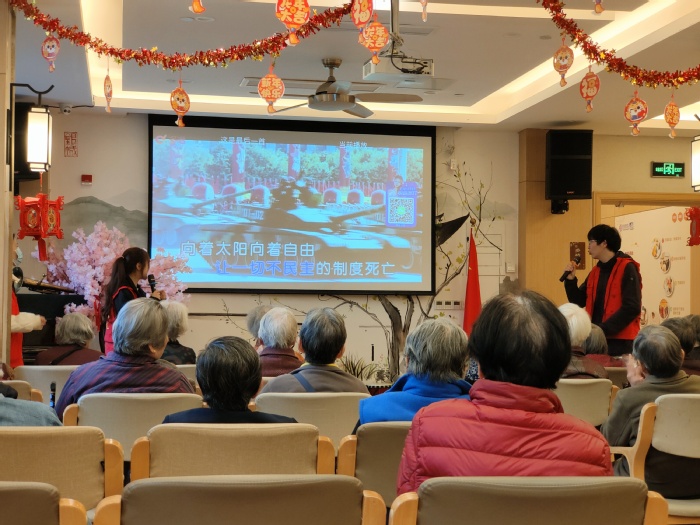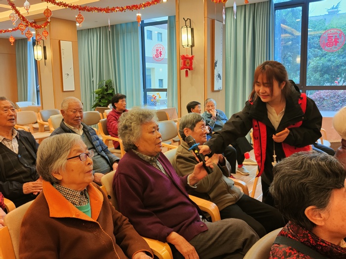 在红歌演唱会的间隙,志愿者们还与老人们进行了亲密的互动。他们走到老人们的身边,与他们握手、聊天,询问他们的身体状况和生活情况。老人们也乐于分享自己的故事和经历,他们的话语中充满了对过去岁月的怀念和对未来生活的期待。