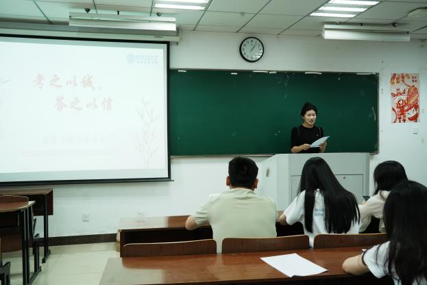 会议伊始,全体人员观看了《诚信考试教育》宣传短片。随后,学生联合会常委陈靖同学领学学校和学院有关考试的规章制度和考场规则,提醒同学们要严格遵守考风考纪,并结合实际案例对考试违纪的严重后果进行了讲解。