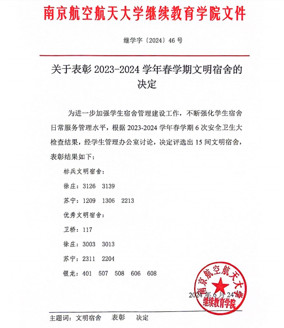 yl8cc永利官网关于表彰2023-2024学年春学期文明宿舍的决定