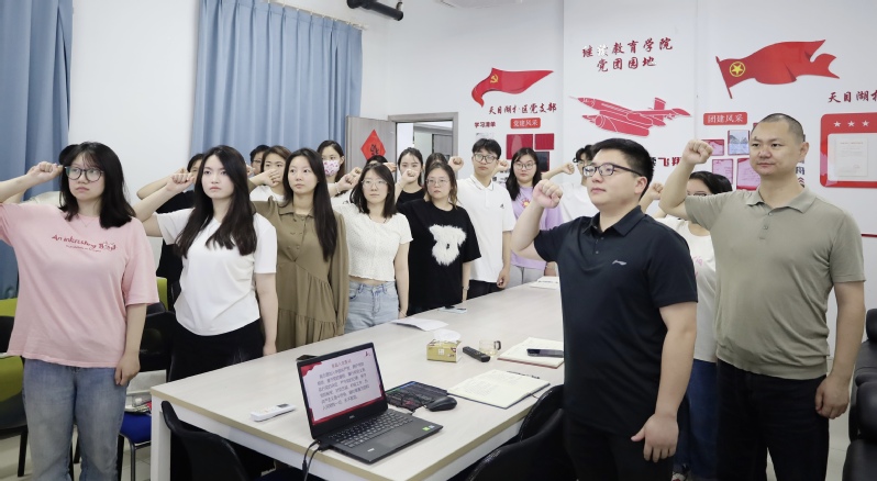 为庆祝中国共产党成立103周年,弘扬伟大建党精神,深入贯彻党的教育方针,为党育人,为国育才,将远大理想、过硬本领、责任担当,坚实地写在祖国大地上。6月26日,学院天目湖校区党支部开展以“红心向党迎‘七一’,砥砺奋进践初心”为主题的迎“七一”庆祝建党103周年主题党日活动。活动分为:红色故事分享、党史知识竞答、专题党课、重温入党誓词四个部分。
