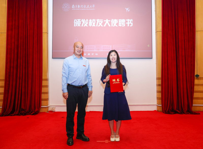 刘建成为校友大使颁发聘书。作为南航校友的代表,“校友大使”将成为校友之间、校友与母校之间的交流合作宣传的重要桥梁。
