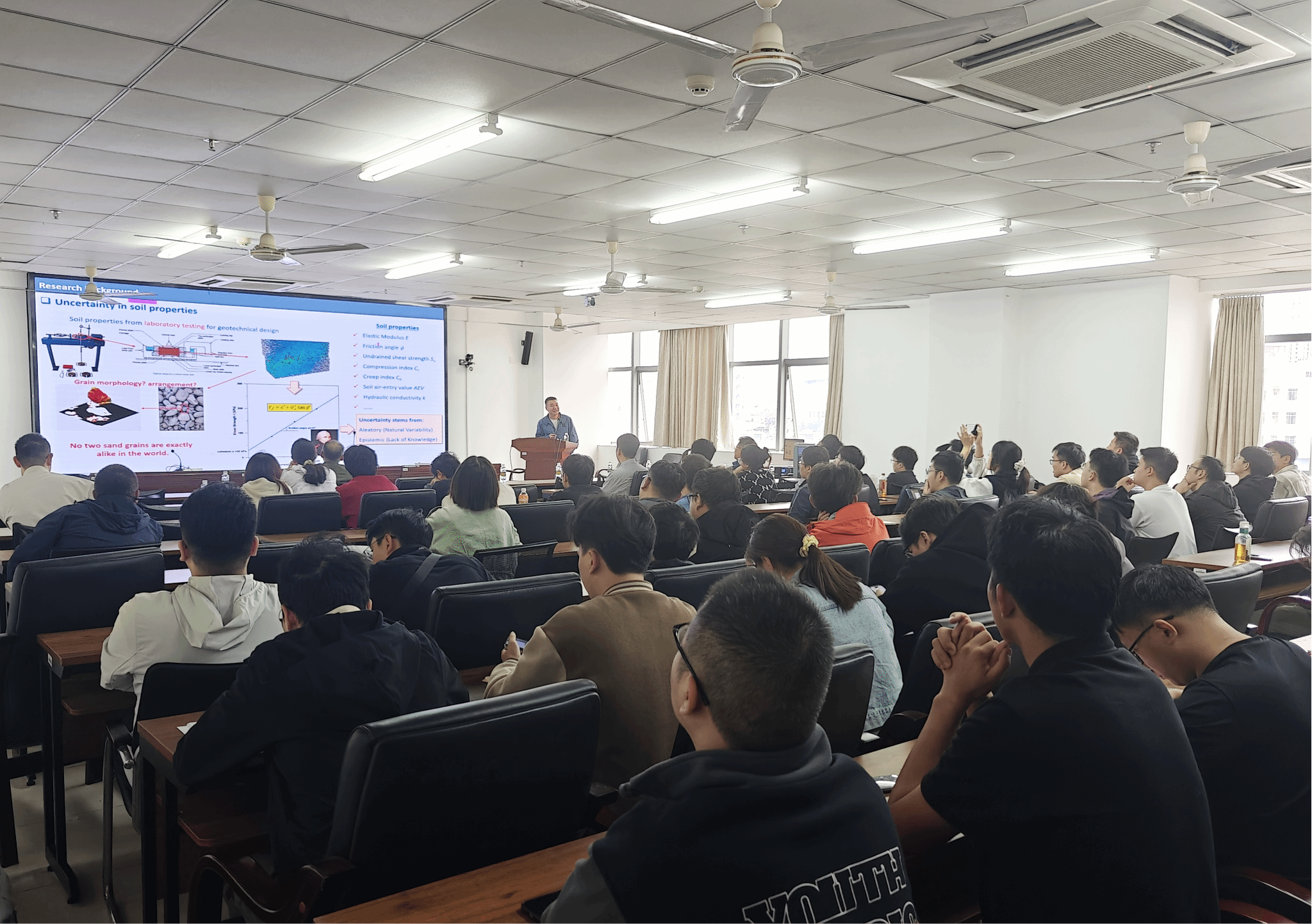 2025年12月25日,香港理工大学尹振宇教授应437ccm必赢国际版邀请,在研发楼510会议室为师生们带来了一场题为《土体特性的数据高效建模与不确定性量化》的学术报告。