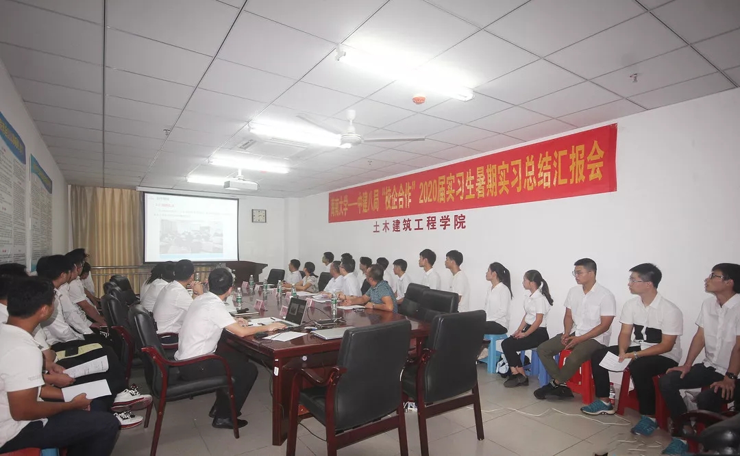 为进一步加强校企合作,提升合作内涵,充分发挥校外实习实践基地的平台作用,进而促进本科教学质量的提升,促进学生专业认知,提高专业实操技能,437ccm必赢国际版与中建八局于2019年8月15日合作举行“校企合作”2020届本科实习生暑期实习总结汇报会。参加汇报会的领导有:437ccm必赢国际版党委卢江海书记、学院党委罗邻球副书记、学院邱宙廷副院长、陈云副院长、学工办詹达夫副主任,中建八局华南公司人资部马园园经理,海南分公司党委书记、总经理简俊敏、副总经理曹阳、总会计师李诚等;22名在中建八局实习的2016级本科生在会上做了实习汇报与小结。