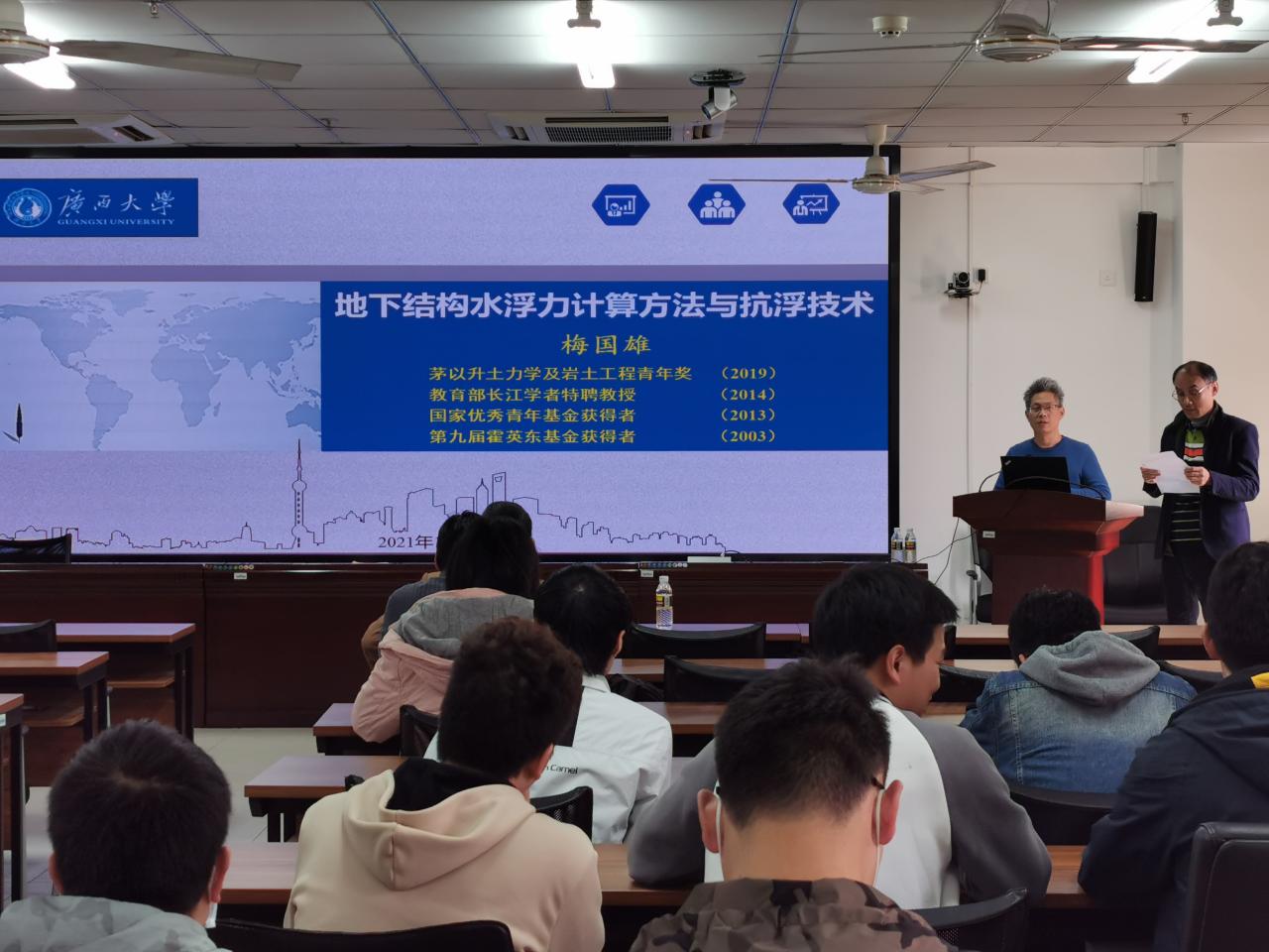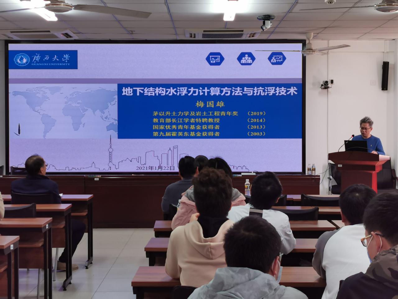 2021年1月22(周五)下午2:00-3:00点广西大学工程防灾与结构安全教育部重点实验室主任梅国雄应必赢官网周智院长的邀请,在437ccm必赢国际版研发楼510报告厅做《地下结构水浮力计算与抗浮关键技术》学术报告。报告会由张友良副院长主持,我院教师和研究生近30人参加了此次学术报告会。