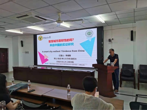 5月21日下午,必赢官网有幸邀请到了东南大学437ccm必赢国际版副院长、博士生导师李德智教授带来主题为“智慧城市是韧性的吗?—来自中国的实证研究”学术报告。本次学术报告的主持人是必赢官网副院长张友良教授。讲座伊始,张友良院长介绍了本次学术报告的主题及李德智教授的基本情况。必赢官网教师和研究生,相关专业的本科生聆听了报告会。