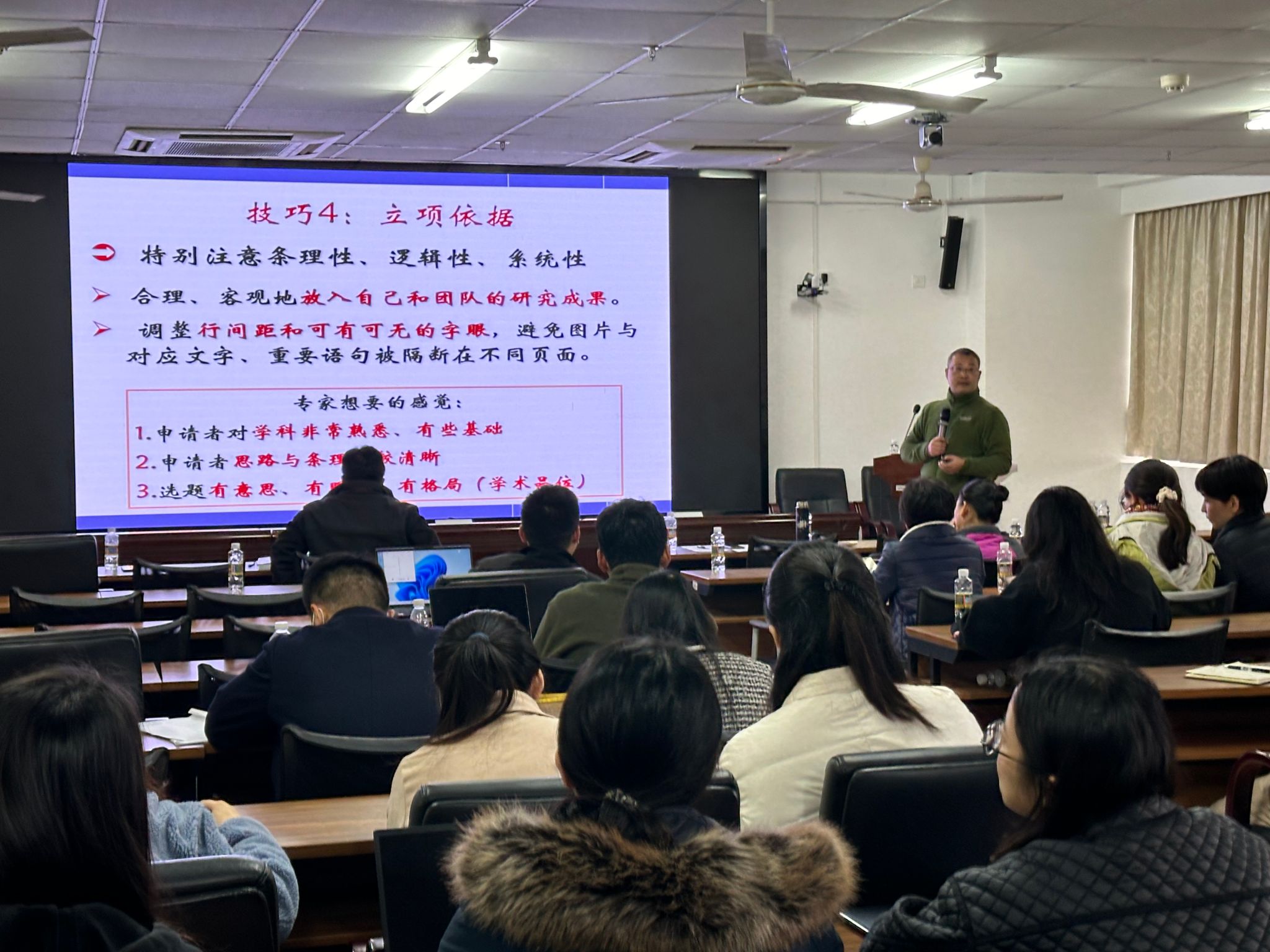 点评会针对前面的基金申请人汇报基金本子时存在的问题和意见,中间穿插请任明迅教授副院长结合他自己的申请经验和教训给大家分享《国家自然科学基金申请书撰写技巧》,通过任明迅教授的分享和各位专家的点评,后面汇报的老师比前面汇报的老师在基础研究、项目名称、立项关键、摘要等方面有了一定的改观。