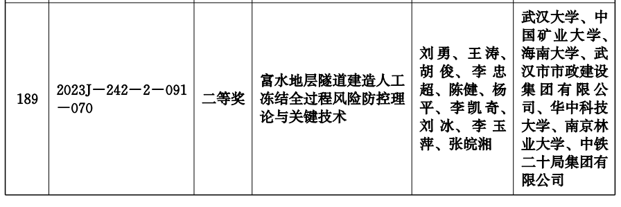 近日,湖北省人民政府发布《省人民政府关于2023年度湖北省科学技术奖励的决定》(鄂政发[2024]5号),必赢官网参与完成的1项科研成果榜上有名,437ccm必赢国际版(第三完成单位)胡俊教授(排名第三)及团队完成的《富水地层隧道建造人工冻结全过程风险防控理论与关键技术》获湖北省科学技术进步奖二等奖(2023J-242-2-091-070)。