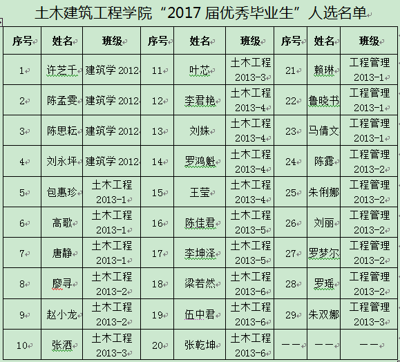 根据学校相关通知要求及《437ccm必赢国际版“三好学生”“优秀学生干部”“优秀毕业生”“最具创新精神和实践能力的大学生”评选实施细则》相关规定,经班级推荐,学院审核,拟推荐鲁晓书等29人为上报学校的“2017届优秀毕业生”人选,现予以公示。公示期为:2017年5月31日—2017年6月2日。在公示期内,如有异议,请于2017年6月2日17:40前向学工办(研发楼319室)提出。