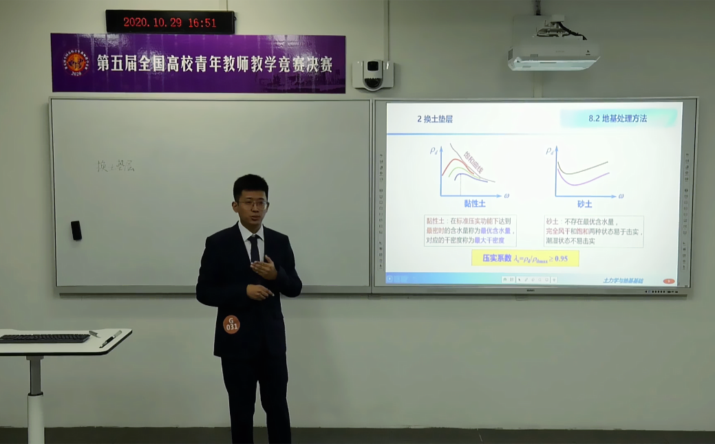 路平老师的参赛课程名称为《土力学与地基基础》。“九层之台,起于垒土”,可见地基土在工程建设中的根基地位;在当前海南自由贸易区建设的战略部署下,高峡平湖、穿江跨海、基深千尺、楼高万丈,土力学与地基基础贯穿着每一个工程领域。参赛课程随机抽取的演示内容为20-地基处理方法”,围绕软弱地基处理中要遵循的三个原则,针对两大类处理方法,利用生活中简单的豆腐受压类比,从现象出发,探究机理,提炼方法。课堂巧用鱼豆腐、冻豆腐的引入,提高学生的学习兴趣,加深学生的感性理解,从承载力的验算方法展开逐层讨论,频繁提问,让学生跟着走,升华认知。让专业回归基础,理论联系实践;课程思政如盐入水,研究前沿启发创新。课程深刻体现了以学生为本”的教学理念,知识传授是基础,能力培养是重点,价值塑造是提升。