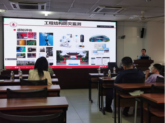 报告中,戴靠山教授介绍了工程结构韧性防灾的技术手段,重点对隔震减震(振)技术和智能监测方法进行讲解,并简单介绍相关技术在包括海南在内的全国不同地区以及一带一路国家的工程应用。报告结束后,戴靠山教授与师生进行了热烈的讨论,对师生感兴趣的问题进行了解答。