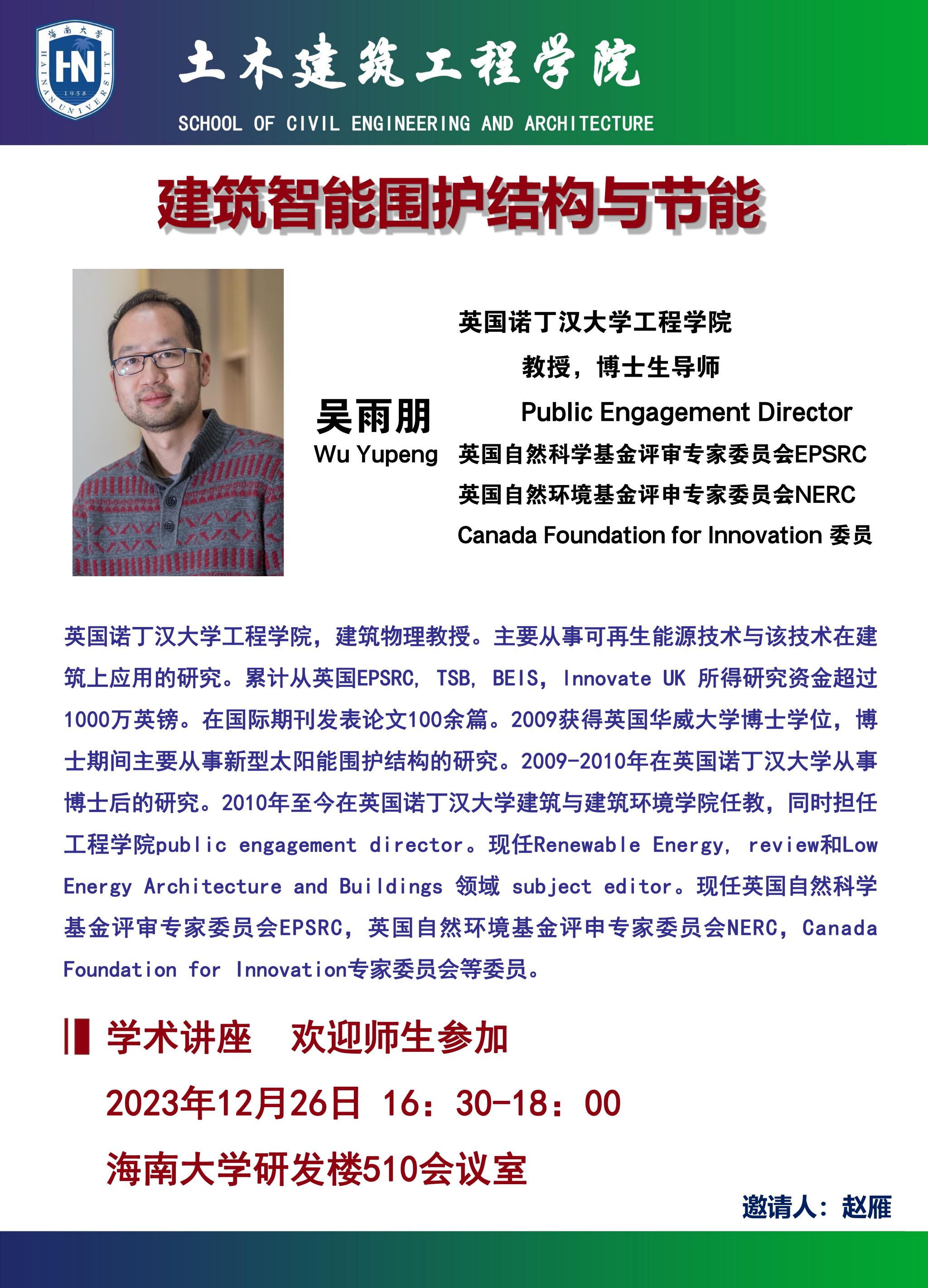 12月26日(周二)16:30-18:00在437ccm必赢国际版研发楼510会议室,英国诺丁汉大学工程学院教授,博士生导师 Public Engagement Director(英国自然科学基金评审专家委员会EPSRC、英国自然环境基金评申专家委员会NERC、Canada Foundation for Innovation 委员),在必赢官网做《建筑智能围护结构与节能》学术报告。欢迎有兴趣的师生参加。
