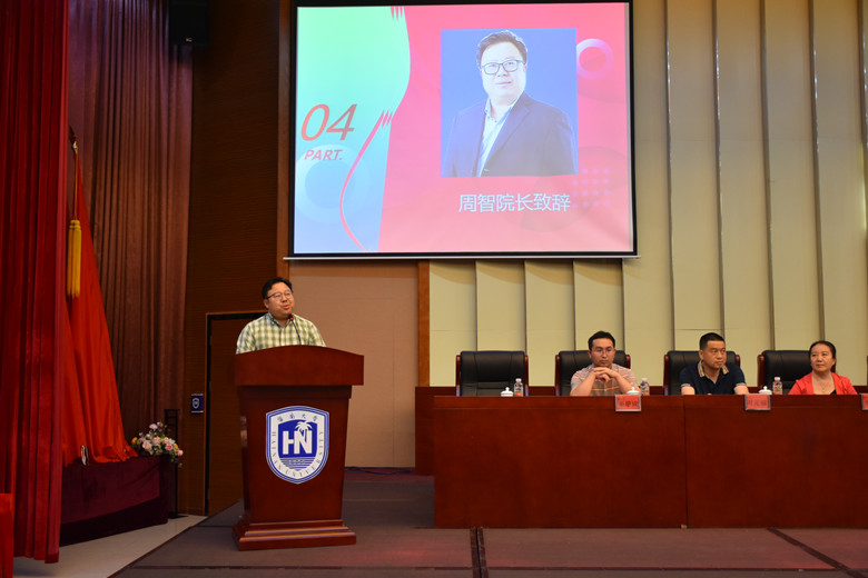 在典礼上,周智院长做了充满温情与希望的致词。周院长回忆了和同学们的日常交往,觉得与同学们交流得还不够,流露出了不舍;介绍了学院的发展和成就,对毕业生在学院建设发展中的努力与贡献表达了诚挚的谢意。向毕业生们提出了“秉承‘海纳百川、大道致远’的校训,践行‘求知问真、修身悟道、追求卓越、引领未来’,谱写人生发展的精彩华章”的殷切希望,期望同学们要认识社会、做一个真实的人,大胆追求公平、正义的“名利”,为社会留下精美的作品。