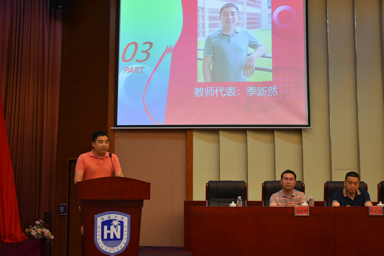 教师代表季新然老师对同学们的顺利毕业致以热烈的祝贺。季老师在发言中表示,从同学们的进步和成长中,深切感受了作为教师强烈的职业幸福感和自豪感。希望毕业生们把“海纳百川”的雅量和大度、“大道致远”的追求和情怀延续到未来的生活和工作中,祝愿同学们拥护一个幸福、快乐、精彩的人生。