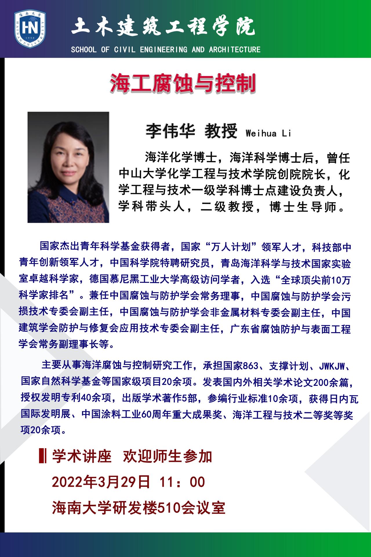 受学院邀请,中山大学化学工程与技术学院李伟华教授,为师生作《海洋工程腐蚀与控制》学术讲座。请相关学科的老师和没有课的研究生准时参加。