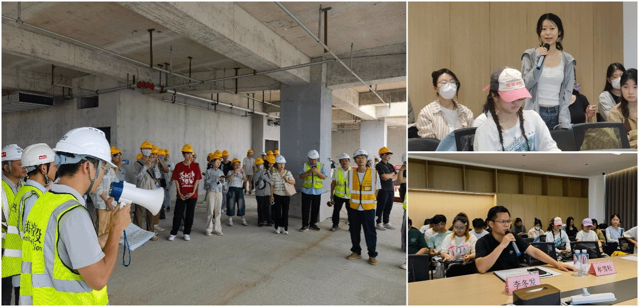 活动聚焦“工程实践与绿色发展”主线,项目团队带领师生深入工地一线,先后观摩了项目展示区、绿色建筑施工关键工艺及低碳技术应用场景,并结合海南地域特点,分享了项目应对“摩羯”百年一遇台风的灾后重建经验。通过现场讲解,学生们直观了解了绿色建材应用、节能设计优化、BIM技术集成等前沿实践,同时深刻认识到防灾韧性设计在沿海地区工程建设中的重要性。