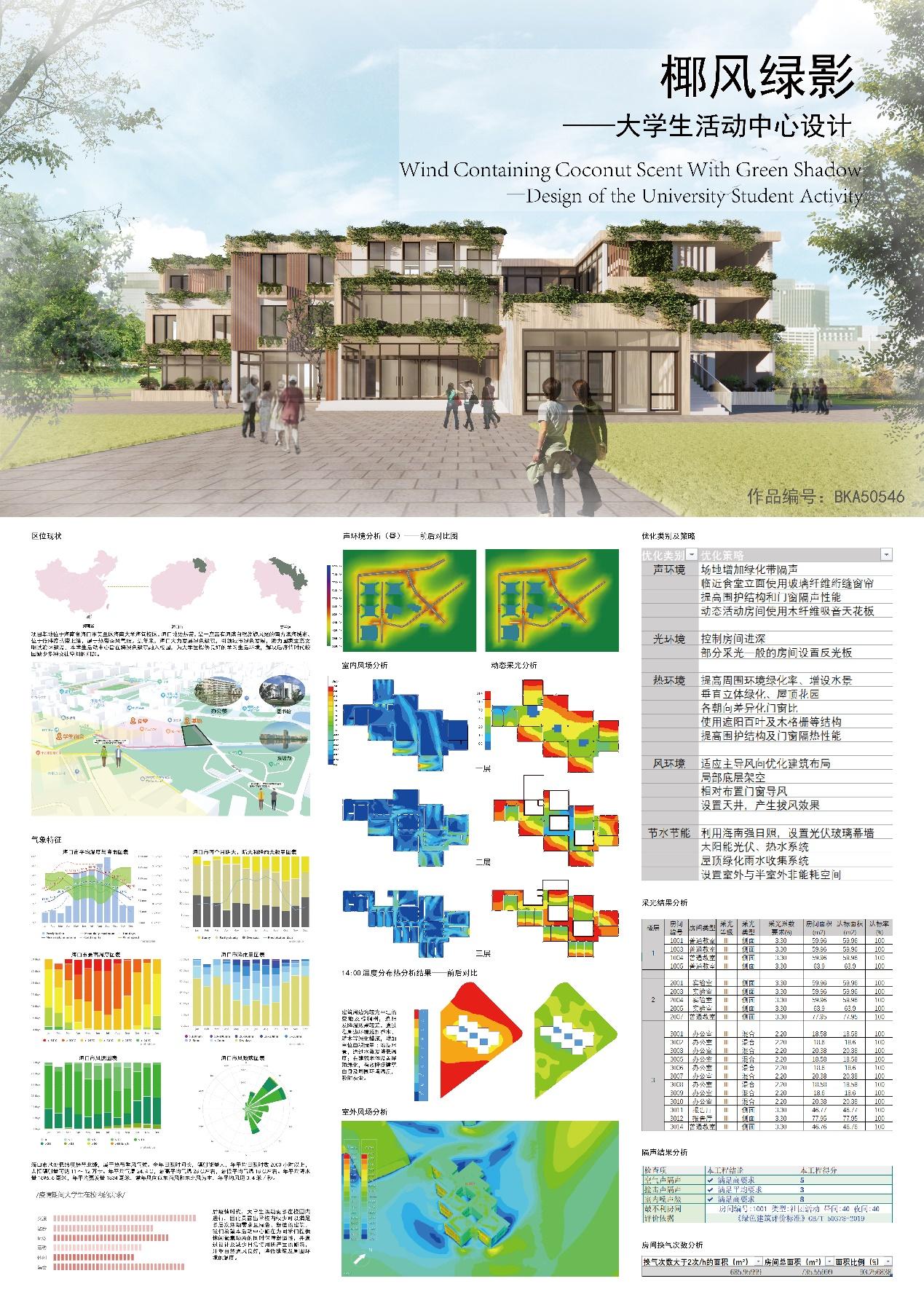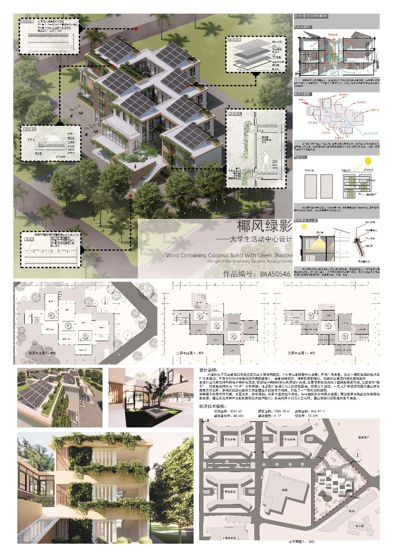 优秀作品奖是椰风绿影——大学生活动中心设计,本建筑位于海南省海口市美兰区437ccm必赢国际版海甸校区,1-8号宿舍楼群中心地带,西临1号食堂,东北一侧有宽阔的起点草坪和东坡湖。在充分地分析场地周边环境的基础上,尊重场地现状,保留优质的绿化、对部分区域进行绿化景观提升。