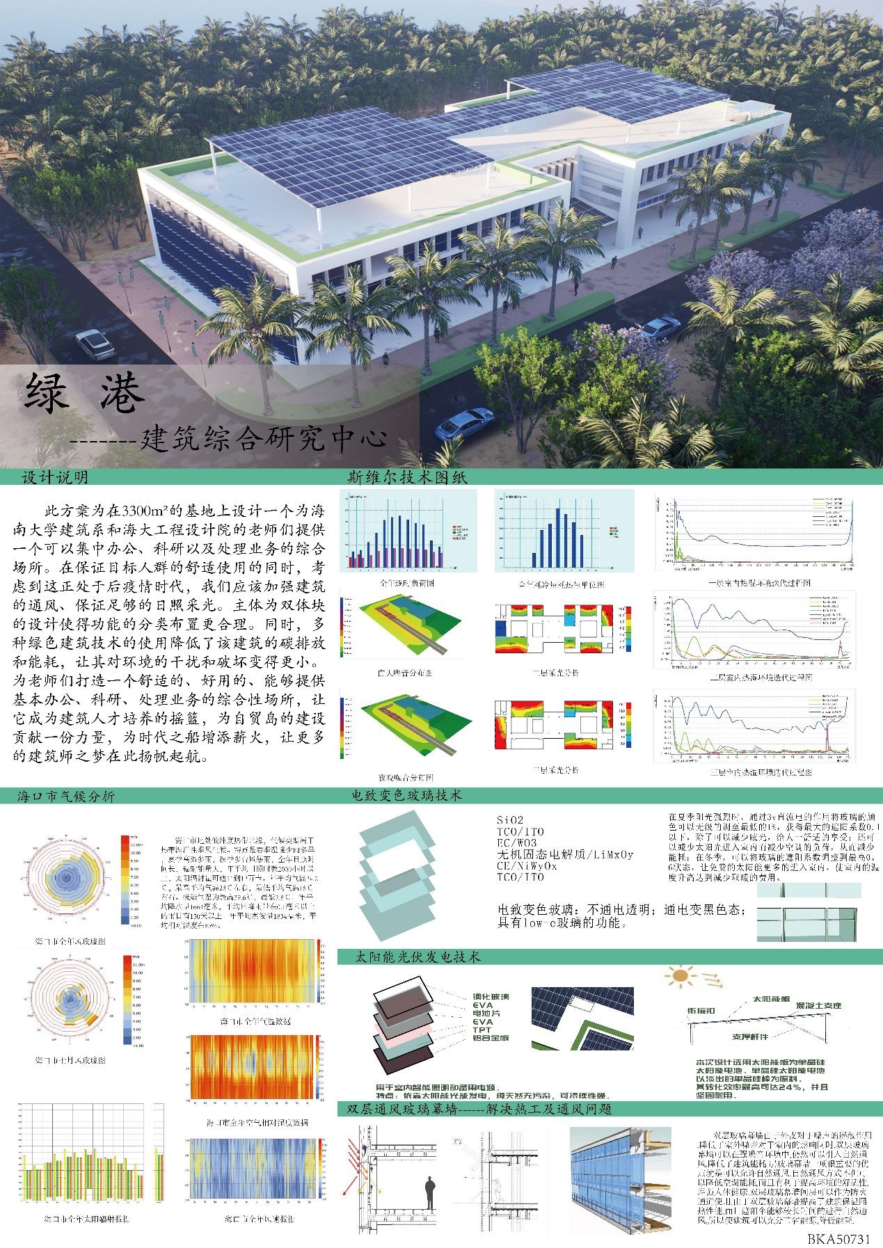 三等奖作品绿港——建筑综合研究中心,此方案是在3300㎡的基地上拟建一个可以为437ccm必赢国际版建筑系和海大工程设计院的老师们提供集中办公、科研以及处理业务的综合场所。在保证目标人群的舒适使用的同时,考虑到这正处于后疫情时代,应该加强建筑的通风、保证足够的日照采光。主体为双体块的设计使得功能的分类布置更合理。同时,多种绿色建筑技术的使用降低了该建筑的碳排放和能耗,让其对环境的干扰和破坏变得更小。为老师们打造一个舒适的、好用的、能够提供基本办公、科研、处理业务的综合性场所,让它成为建筑人才培养的摇篮,为自贸岛的建设贡献一份力量,为时代之船增添薪火,让更多的建筑师之梦在此扬帆起航。