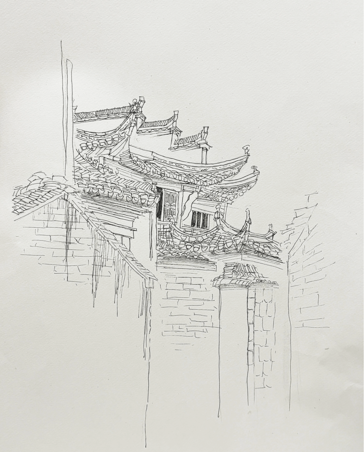 蒋伊琳老师在进士第前示范了记录建筑内部结构的速写方法和对建筑主体及配景主次区分的表达技法,并在傍晚评图时对建筑水彩表达的几个层次进行讲解。