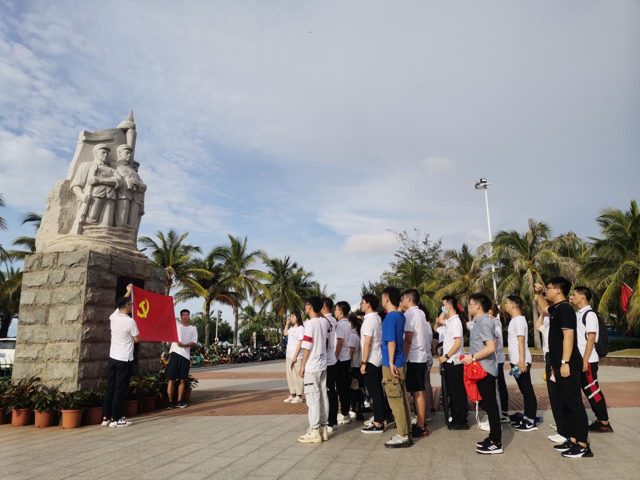 首先,研究生党支部刘瑞同志在白沙门公园渡海英雄纪念碑前介绍解放军渡海作战情况,全体党员怀着崇敬之情,在纪念碑前默哀;随后,第二学生党支部韩广同志作为党员代表发言,分享对红色记忆的感悟,以及为祖国建设添砖加瓦的决心;最后,由第一学生党支部陈寅颖同志带领全体学生党员重温入党誓词。