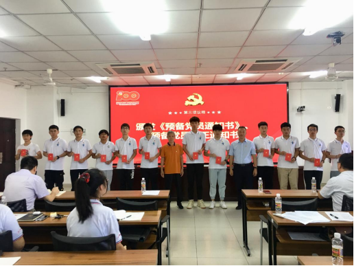 会议第二个阶段,学院党委召开新党员入党宣誓大会。党委委员邱宙廷同志宣读学院党委《关于接收林思宇等51名同志为中国共产党预备党员的通知》《关于批准预备党员转正的通知》文件。全体党员进行入党宣誓和重温入党誓词,卢江海书记领誓。学院党委为新发展党员、新转正党员颁发《预备党员通知书》《预备党员转正通知书》。新发展党员代表周南同志作入党表态发言。